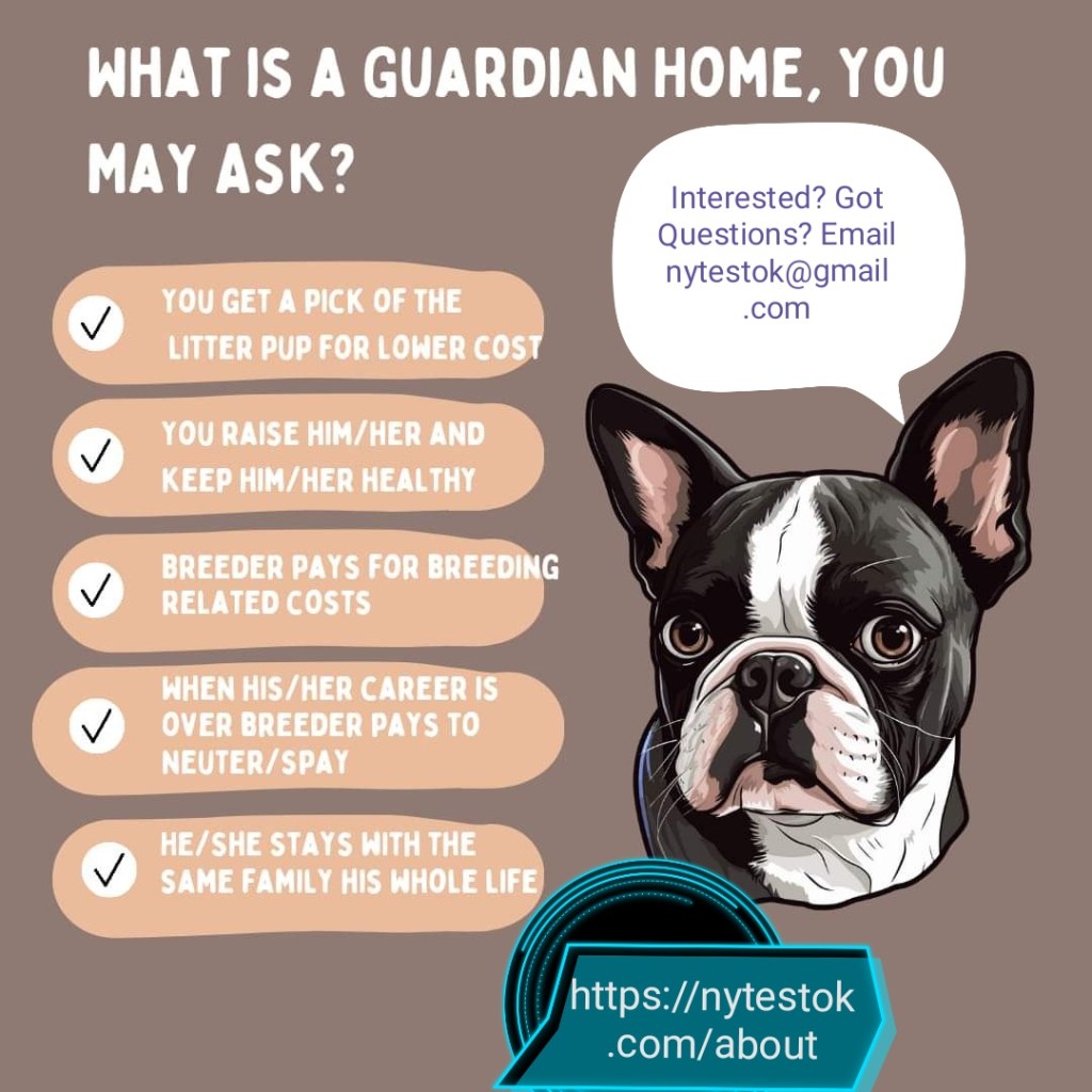 Upfront costs if we haven’t worked together before: $400 Boston Terrier, Frenchtons, Frenchie, Shar Pei or Poodles (pricing includes spay at the end of the program).